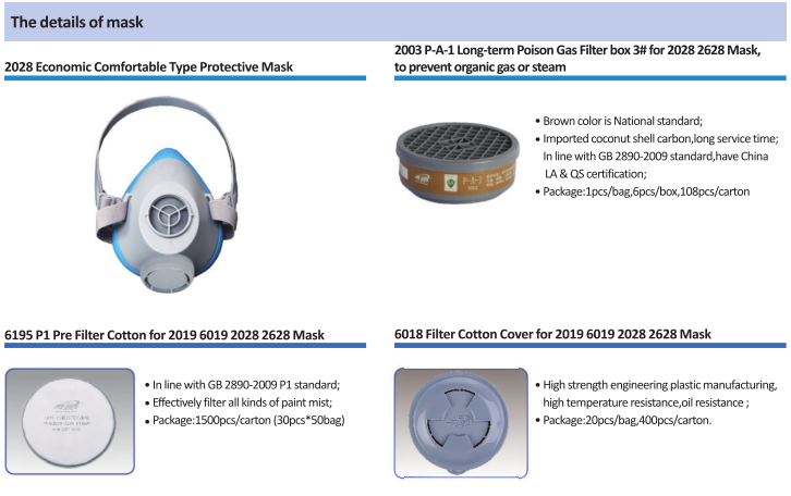 ●With a filter box P-A-1(3#), to prevent organic gas or steam,for example,benzene and it’s homologous ,aniline, gasoline, acetone, carbon disulfide, alcohols, ether, aldehyde, carbon tetrachloride, three potassium chloride, celfume, methyl chloride, nitrobenzene,  nitroalkane, chloropicrin;