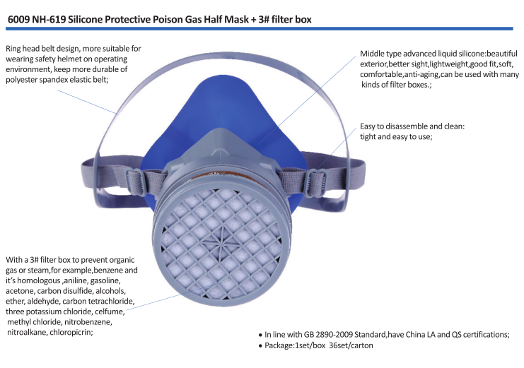 ●With a 3# filter box to prevent organic gas or steam,for example,benzene and it’s homologous ,aniline, gasoline, acetone, carbon disulfide, alcohols, ether, aldehyde, carbon tetrachloride, three potassium chloride, celfume, methyl chloride, nitrobenzene,  nitroalkane, chloropicrin;